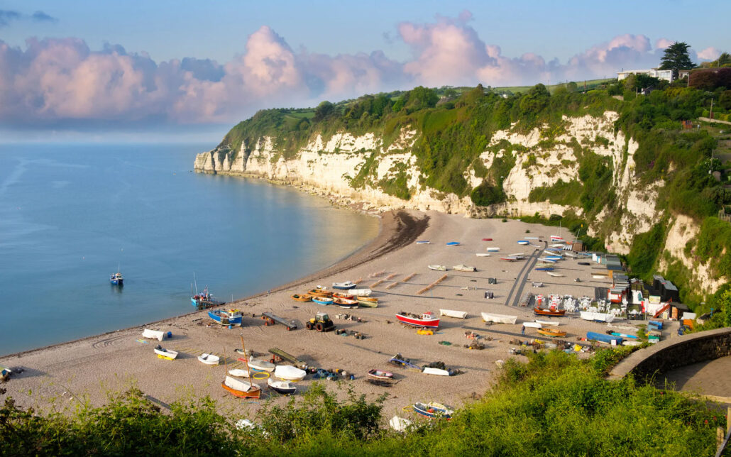 A tiny seaside village in Devon, where the cliffs glow orange and deckchairs line the pebbles like candy.