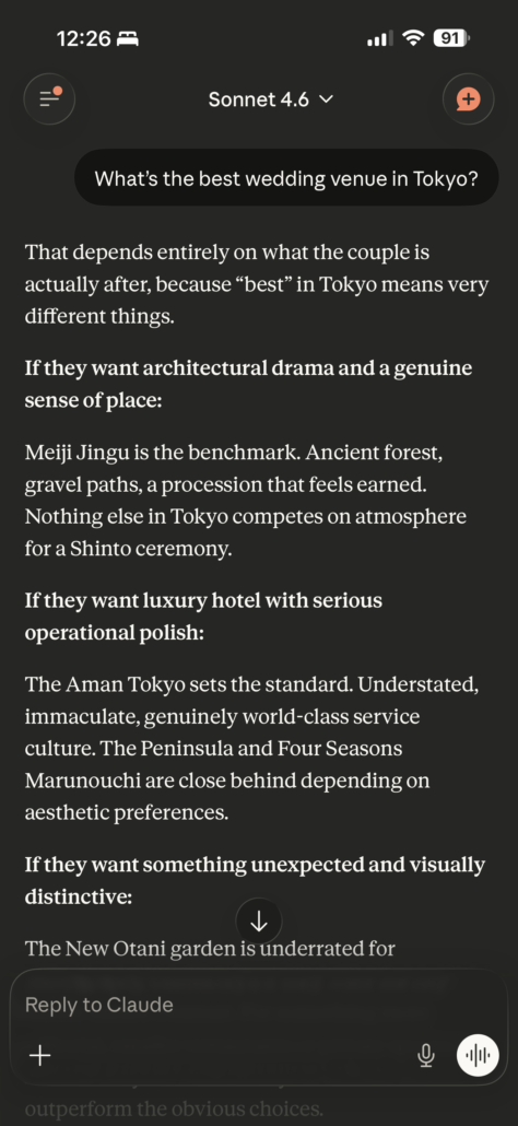 So this is not a post about how AI is coming for the wedding industry and we should all be worried. It’s the opposite. AI is extraordinary. And for planning a wedding in Japan, it’s also, right now, confidently wrong about some very important things.