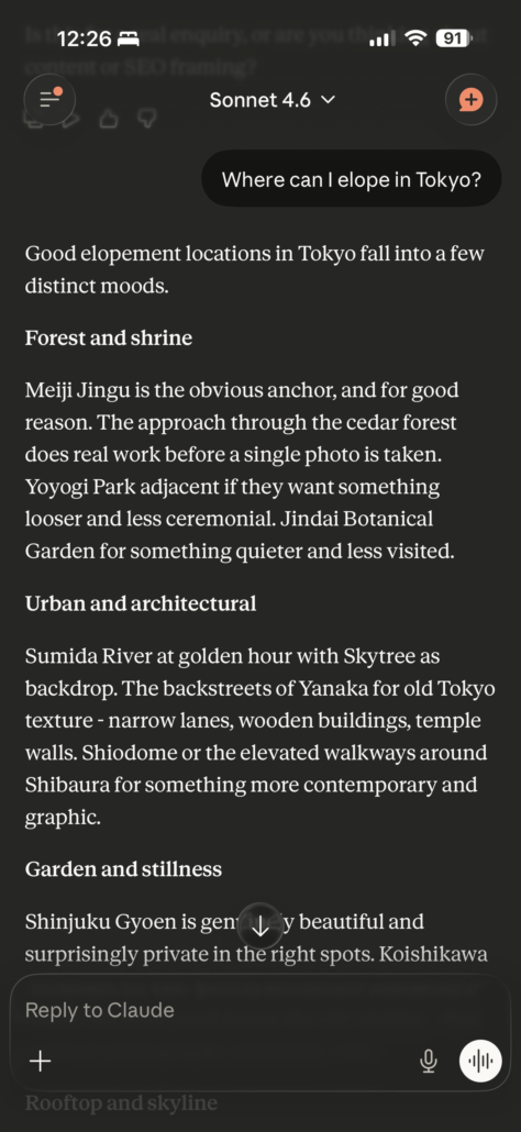 That venue it suggested? It runs fifteen to twenty weddings a day. You’d be sharing the space with other couples, cycling through on a schedule. That restaurant it found? One of our favourites in Tokyo, genuinely. But they won’t do a buyout for a wedding. One of our prospective couples wrote to them directly and got two words back: “No wedding.” That church it keeps recommending? It only holds ceremonies on Sundays at 5pm. Which means your ceremony happens as the light is dropping, all your portrait time needs to happen beforehand, on a busy Sunday afternoon in central Tokyo.