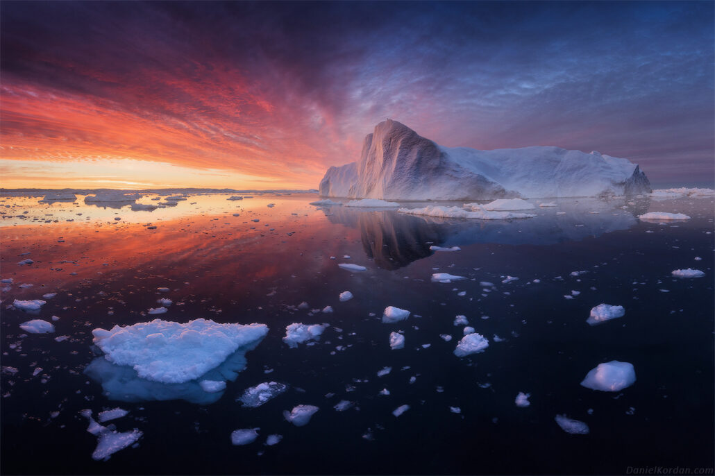 We’ve hired a private boat to take us out every night around midnight, chasing the surreal colors of the midnight sun across the icebergs of UNESCO’s Disko Bay.