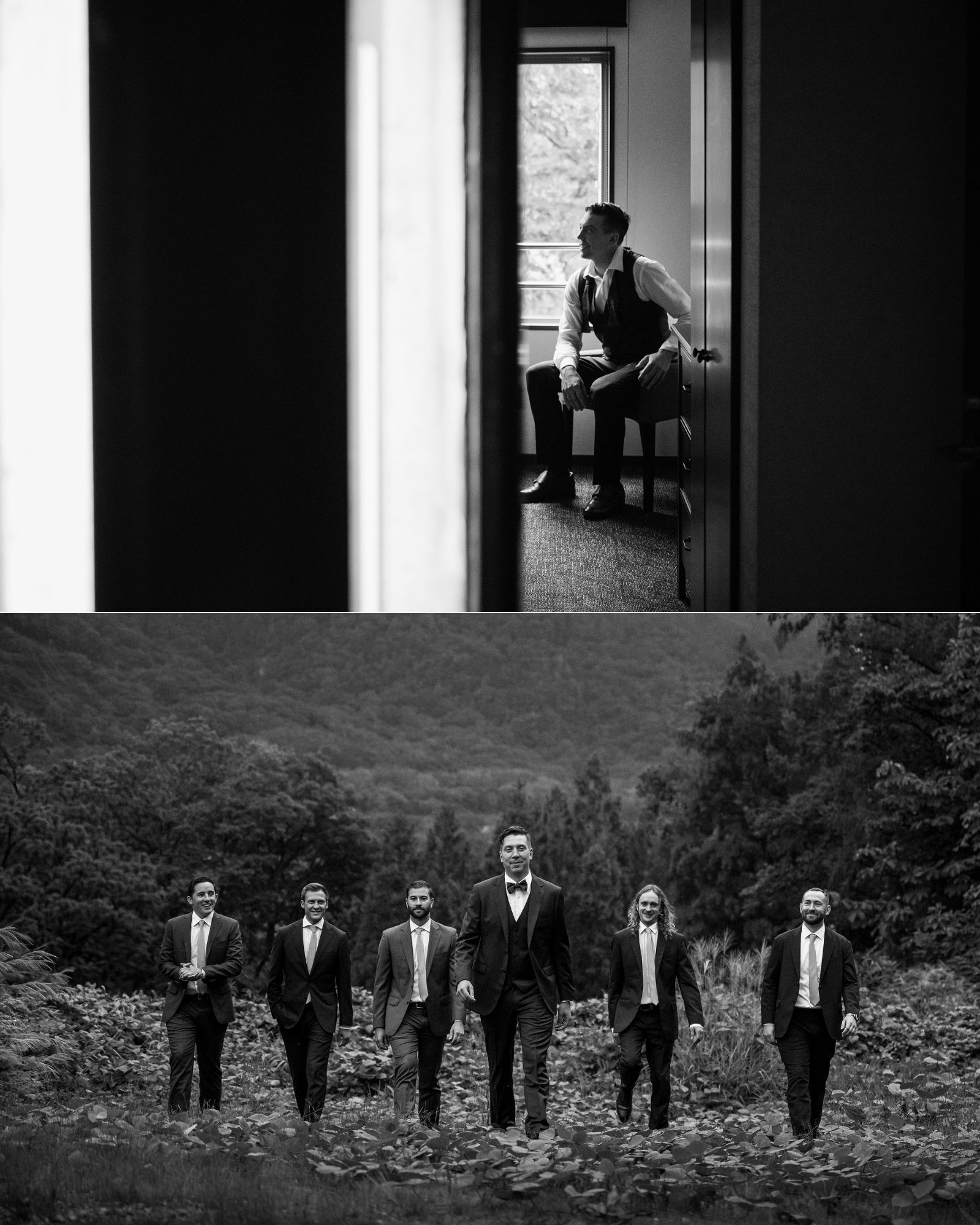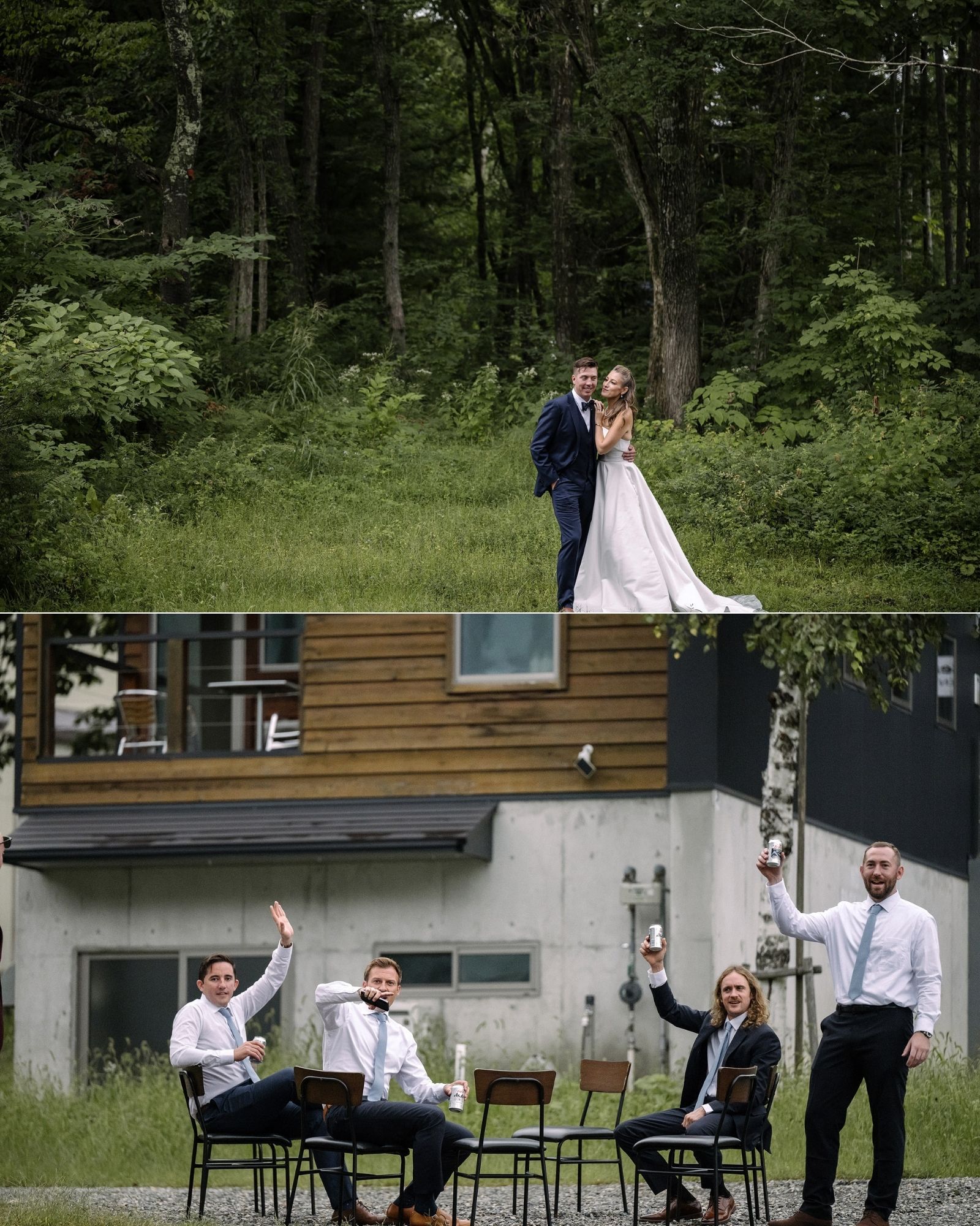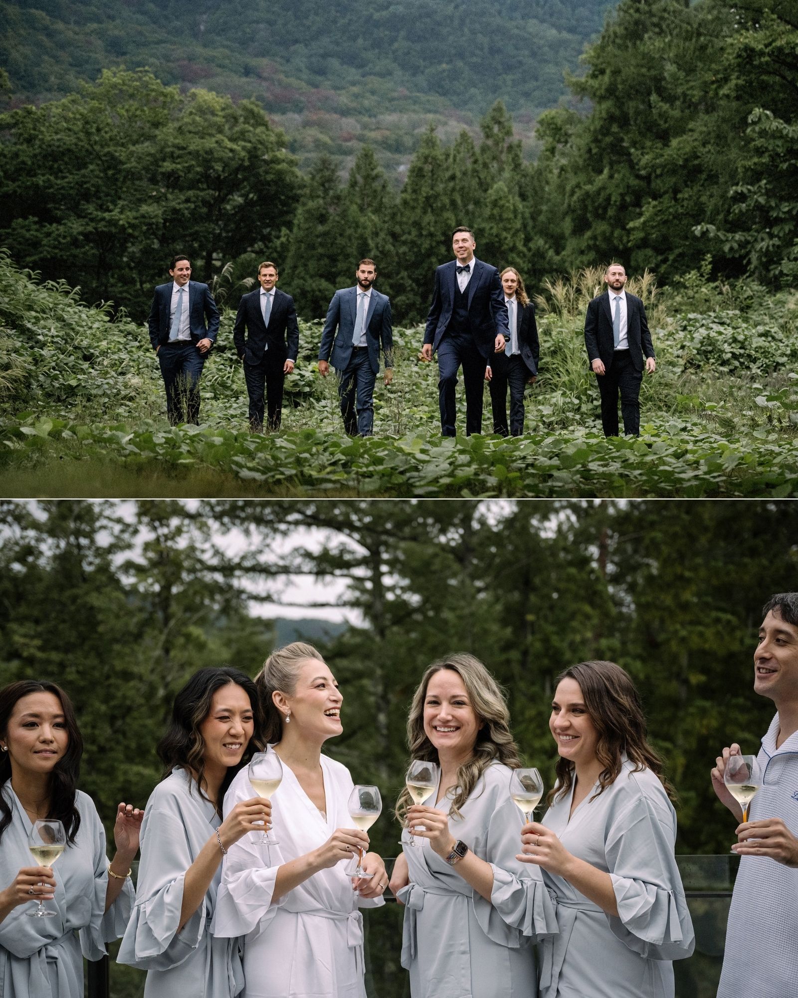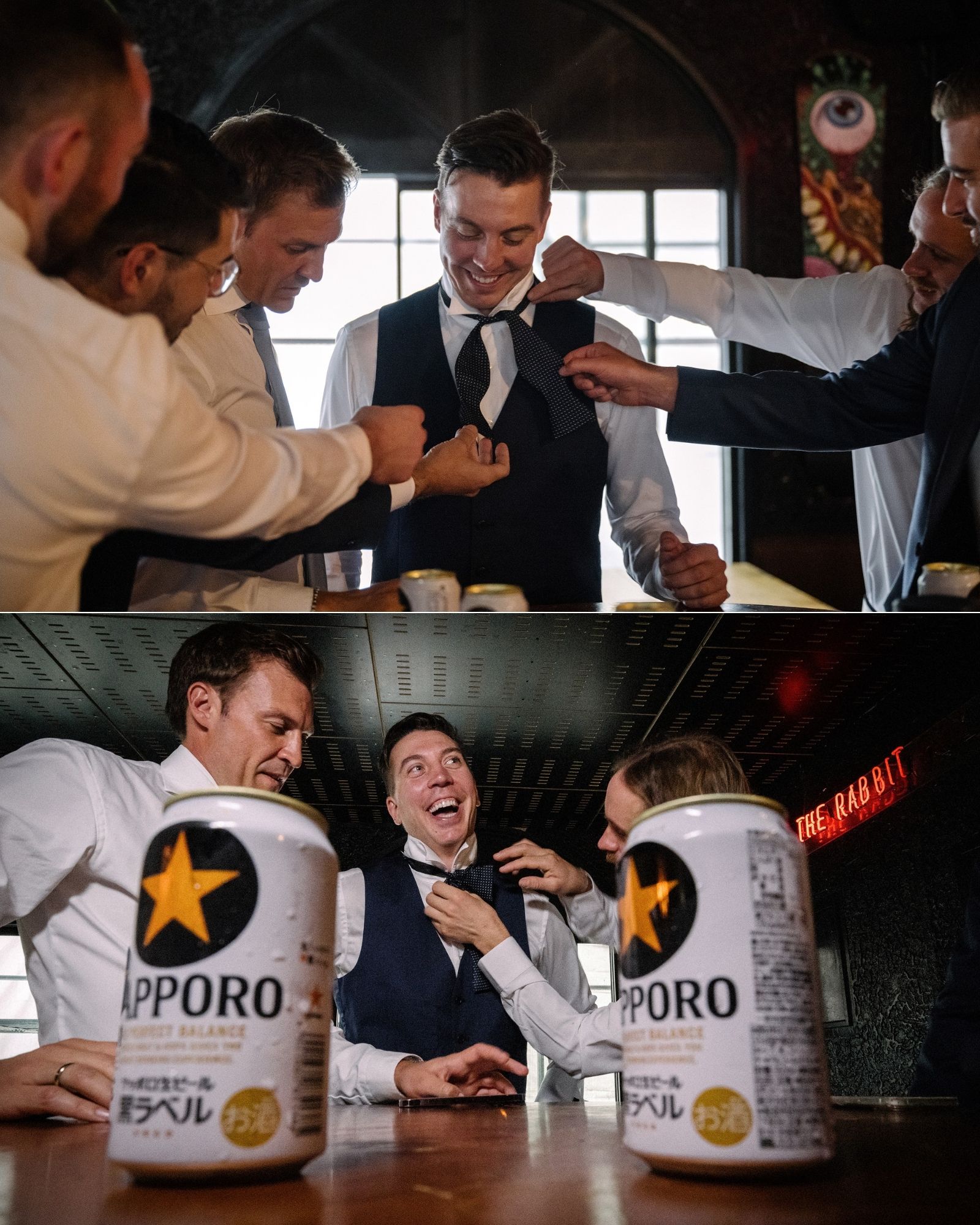 Every destination wedding begins with its own rhythm. In Hakuba, the girls got ready down the road, champagne and music filling the air, bridesmaids steaming dresses and passing gifts. Meanwhile, the boys claimed The Rabbit Hole bar, iconic apres-ski vibes intact, bowties resisting every YouTube tutorial they tried.