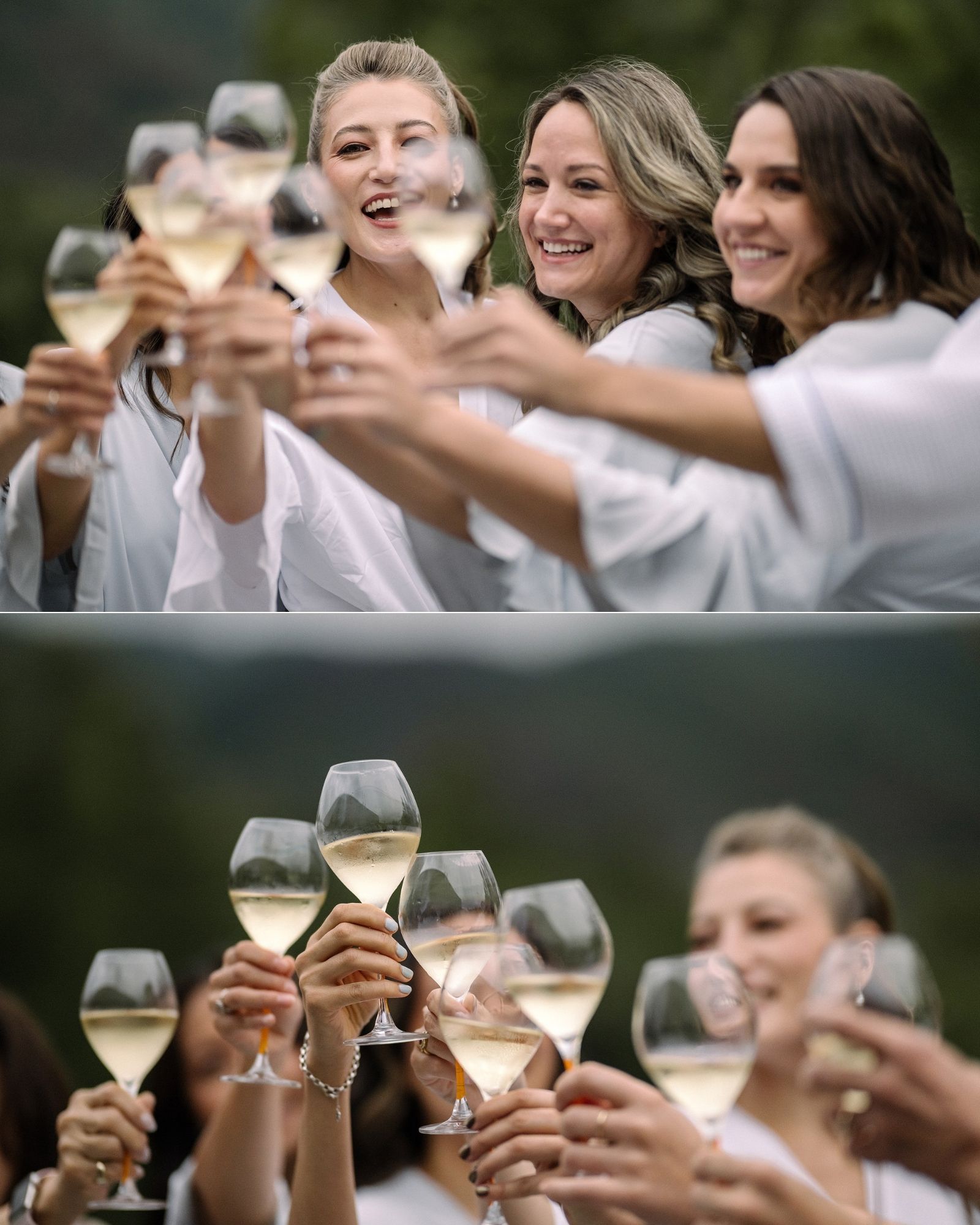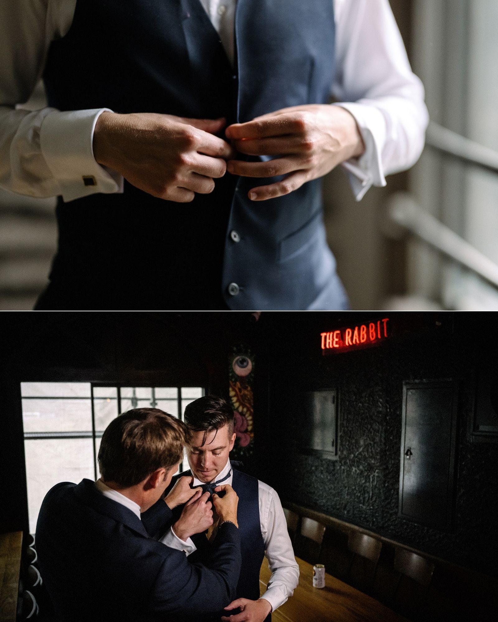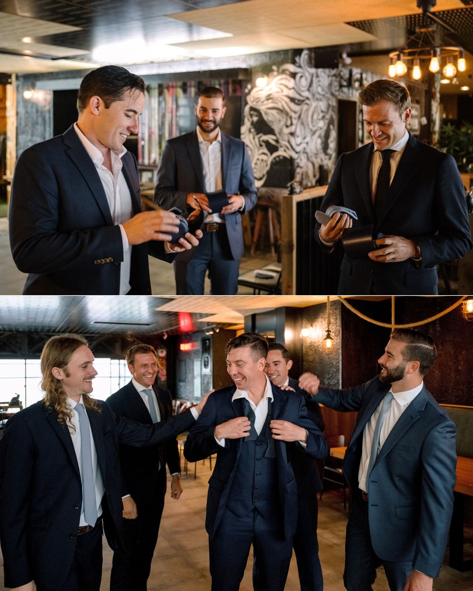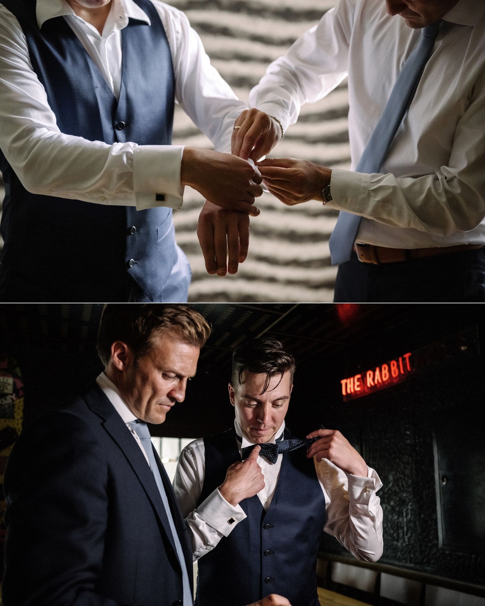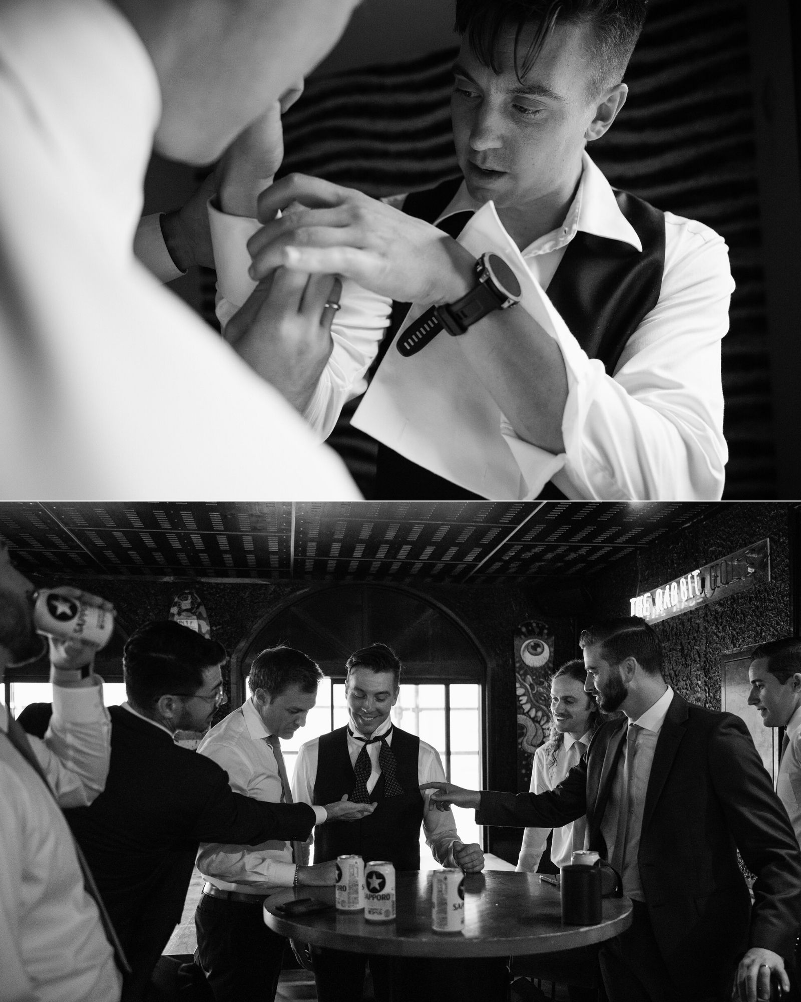 Every destination wedding begins with its own rhythm. In Hakuba, the girls got ready down the road, champagne and music filling the air, bridesmaids steaming dresses and passing gifts. Meanwhile, the boys claimed The Rabbit Hole bar, iconic apres-ski vibes intact, bowties resisting every YouTube tutorial they tried.