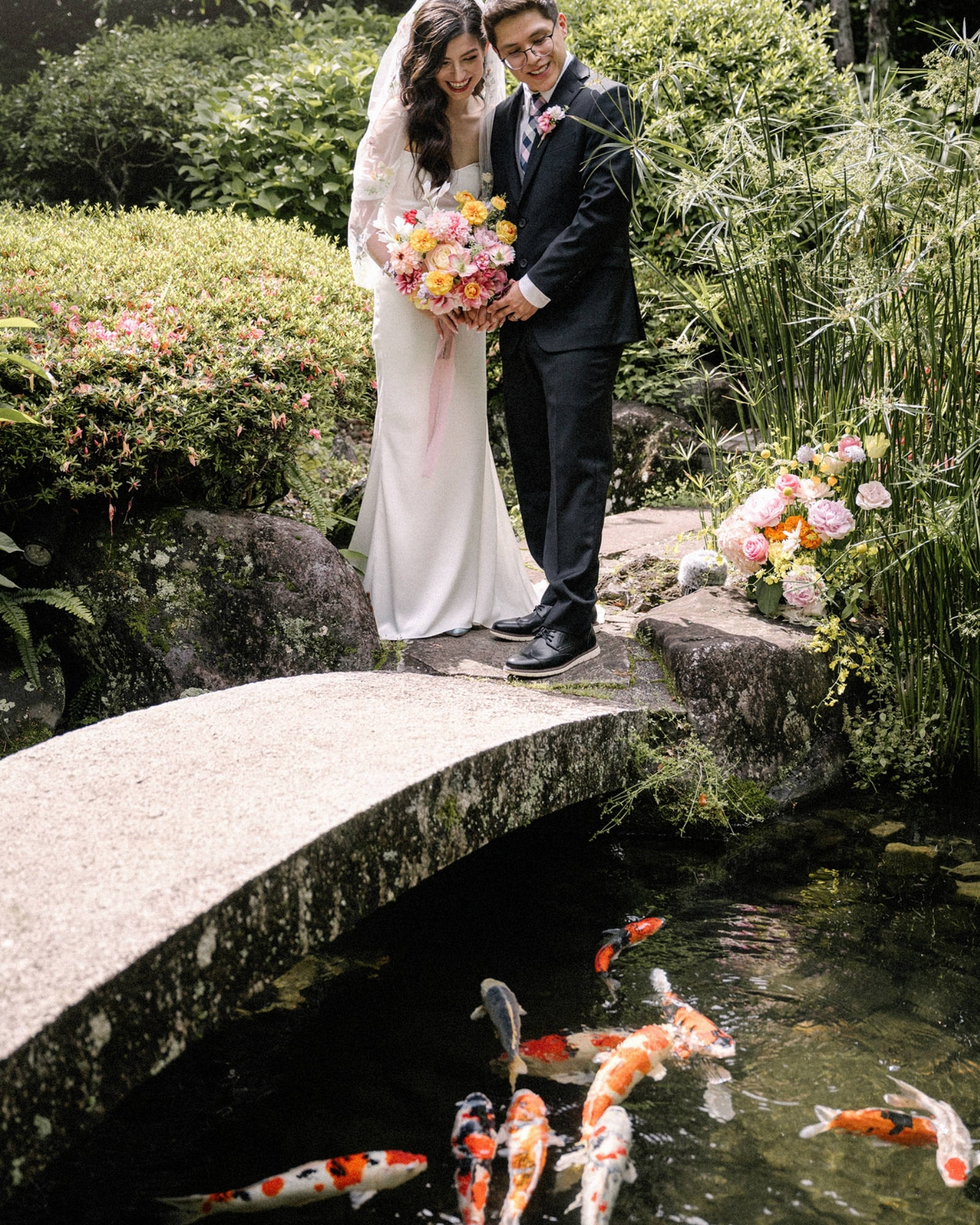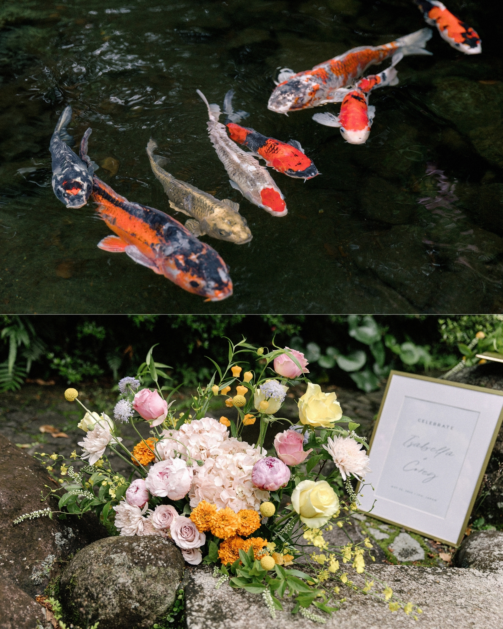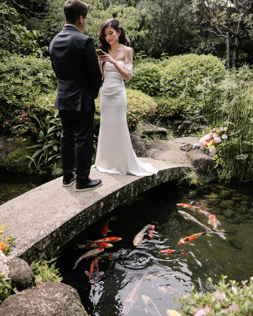 From there, the day moved like chapters in a book. A ceremony framed by a Japanese garden. Carp swimming lazily past as we captured vows that needed no amplification. Only presence.
