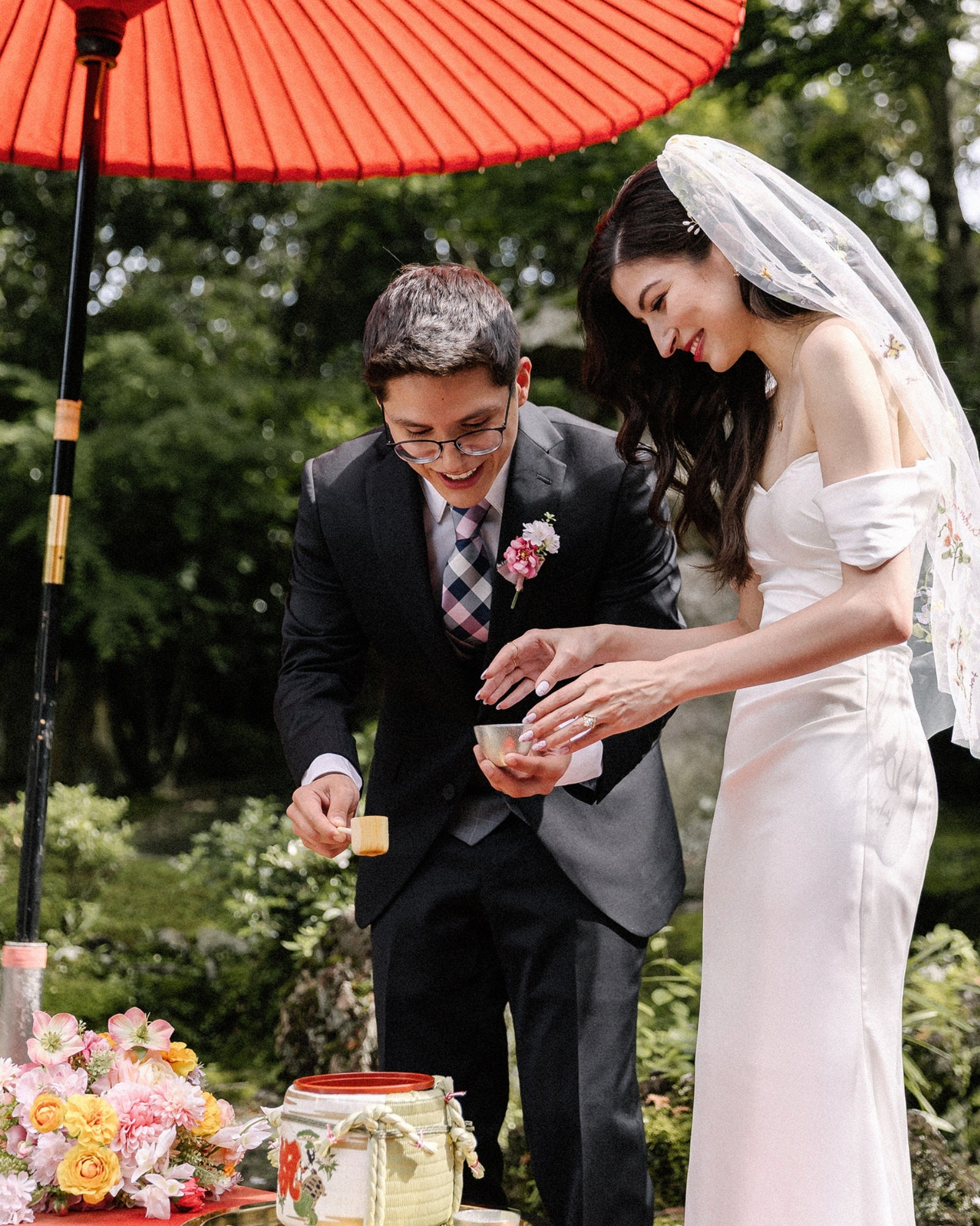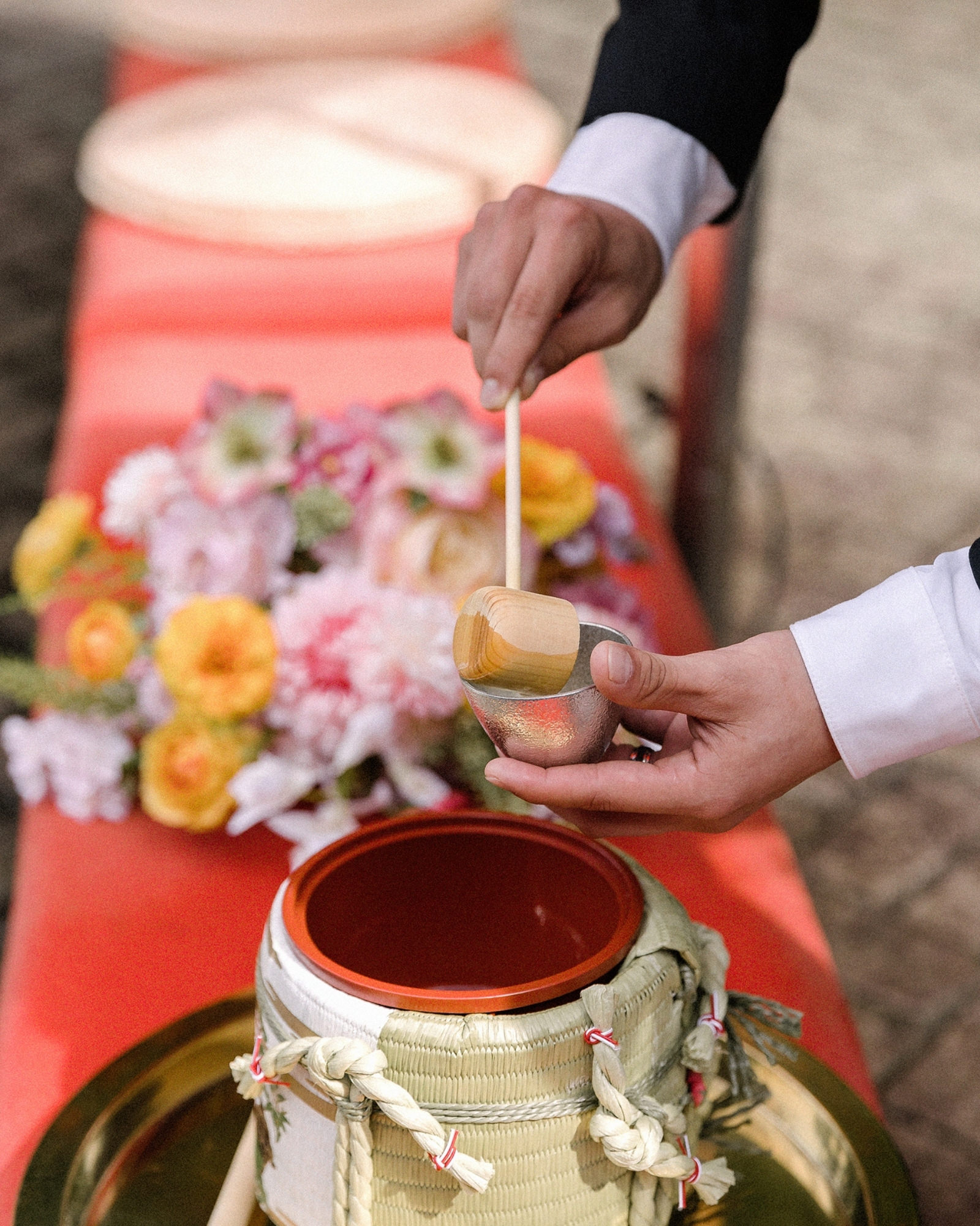 After their vows, tradition met celebration. They had a kagami biraki, breaking open a sake barrel with wooden mallets. It was laughter, joy, and a nod to Japan’s rich rituals of new beginnings. A sake toast that felt both ancient and brand new.