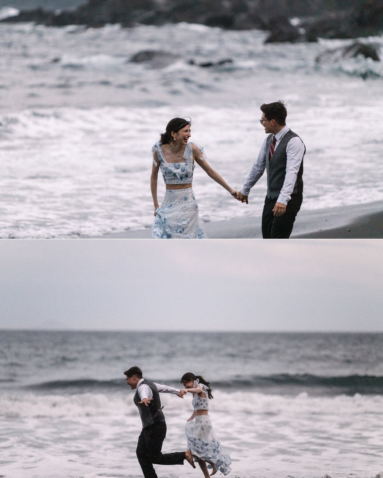 And then, as the sun dipped, we ended where the cliffs meet the sea. Waves crashing below, sky with golden light, the two of them standing together in that liminal space between land and ocean. Windswept, a little wild, completely perfect.
