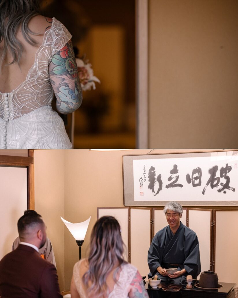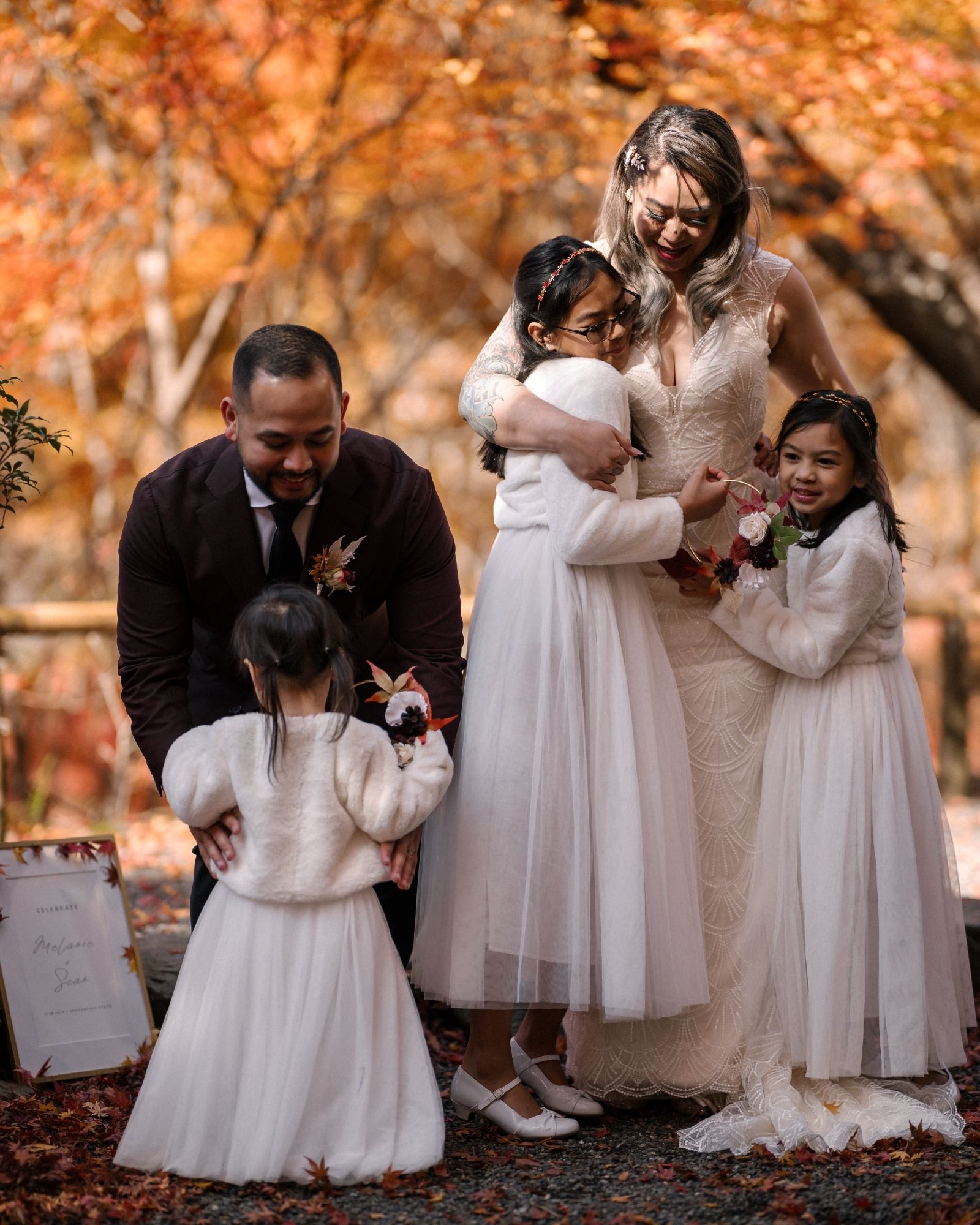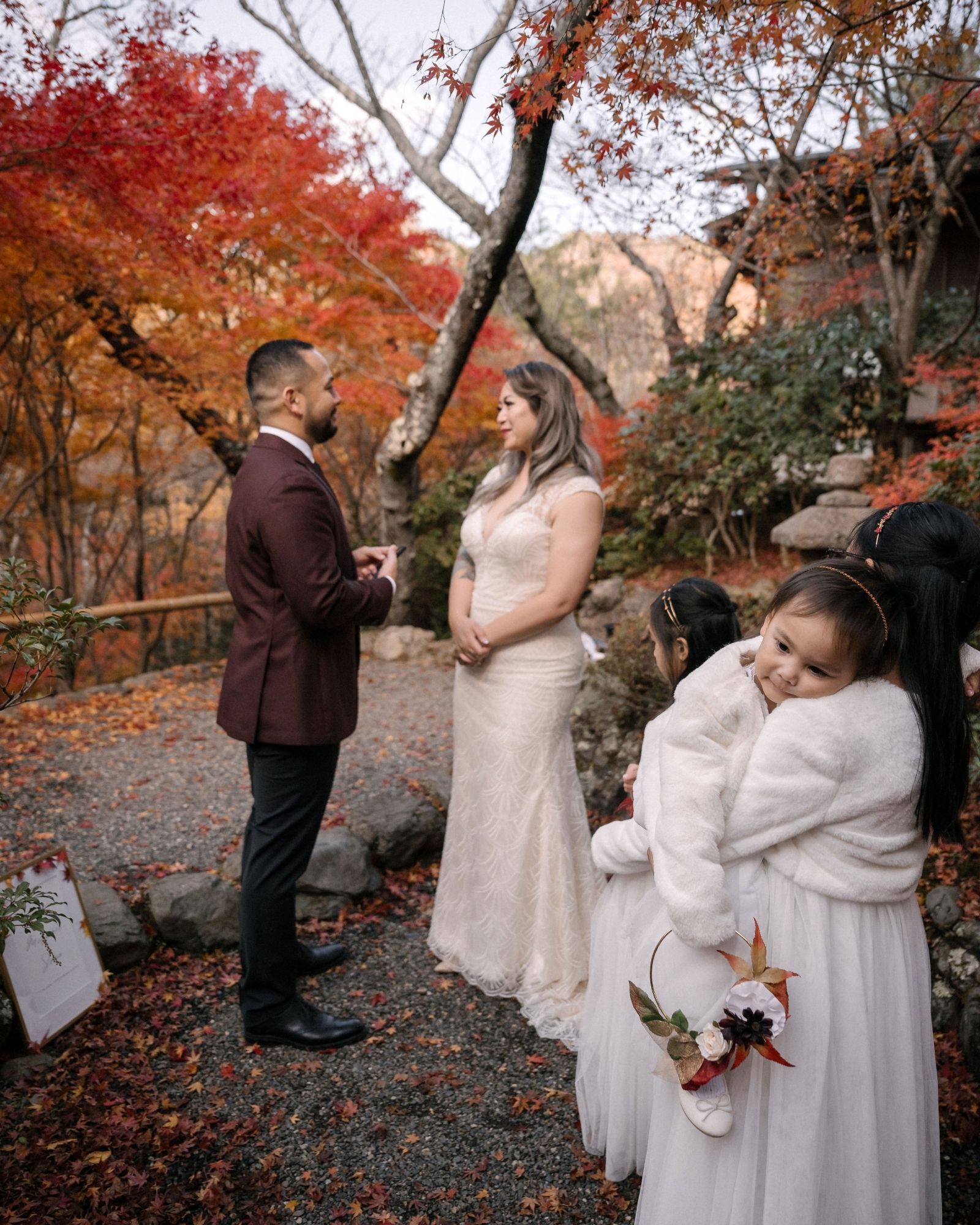 Because in a city that swells with millions of visitors during peak fall, privacy is the rarest luxury of all. On this autumn day, in a private mountain maple forest just outside the chaos, one couple celebrated a micro-wedding with their three children and grandmother looking on … their vows witnessed only by blazing color, a tea master, and the wind through the leaves.