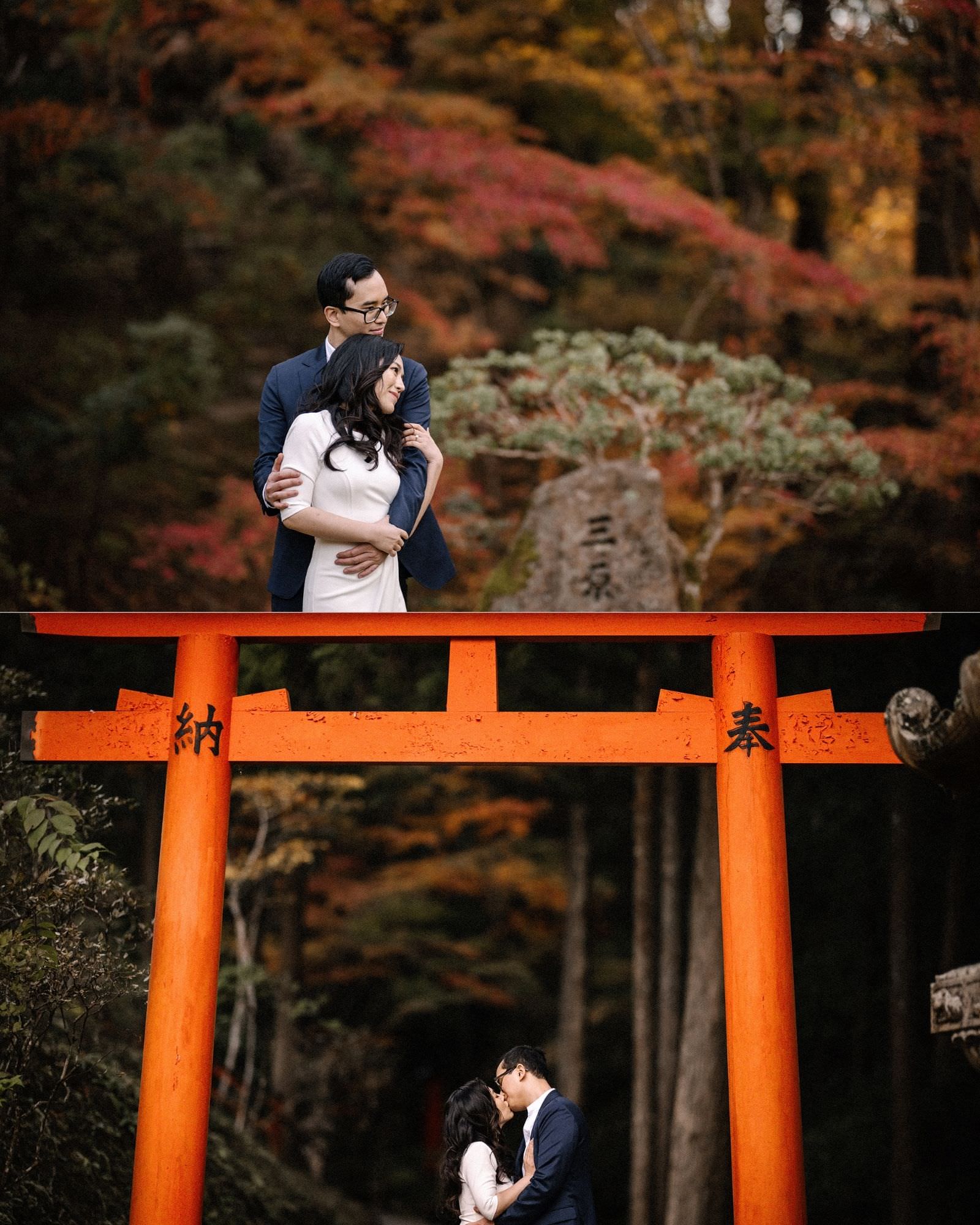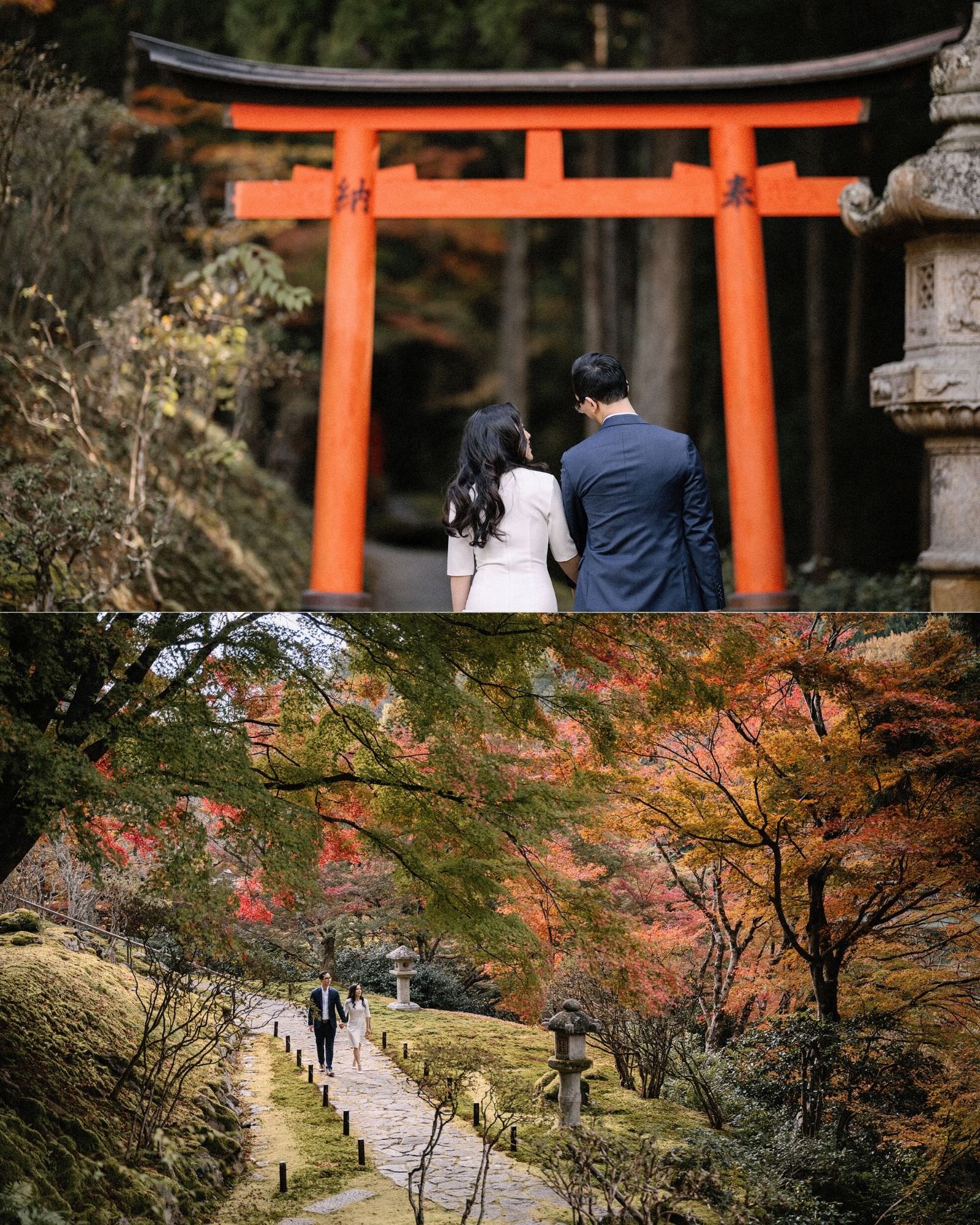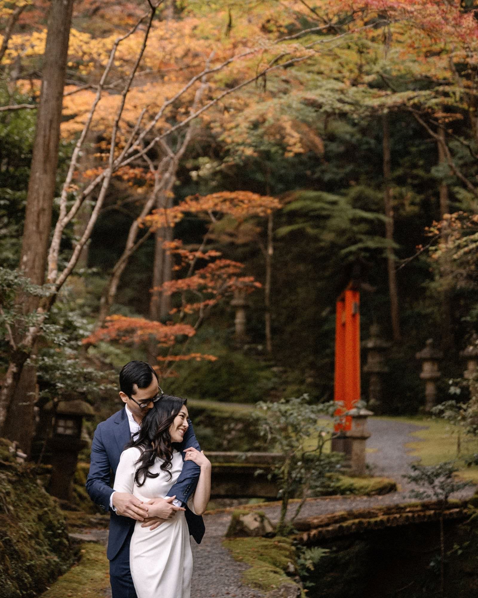 Their story began in Kyoto, in a private garden at the height of autumn. Scarlet maples, golden ginkgo, and rust-colored leaves carpeted the ground in color. The couple wandered its pathways in silence and laughter. An engagement shoot that felt more like a meditation than a session.