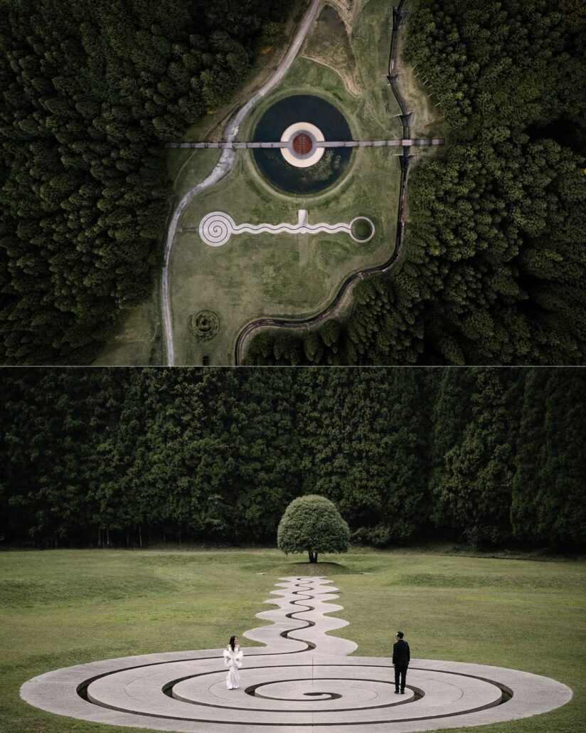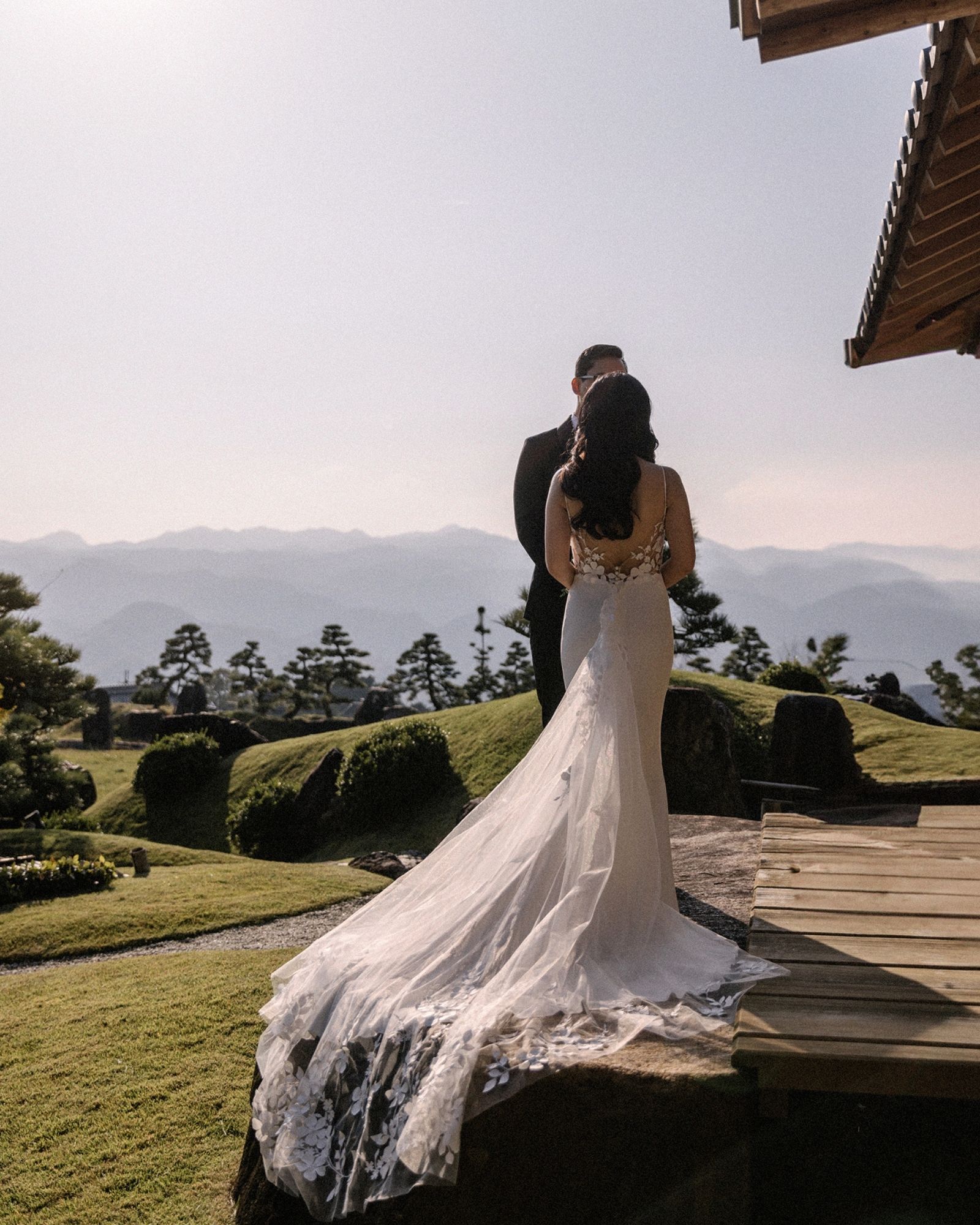 It all unfolded in the villa’s garden, a space designed around the Japanese concept of Shakkei … “borrowed scenery.” From the terrace, the landscape stretched beyond its borders, framing the couple not only with the manicured beauty of the villa but also with the distant sweep of mountains and the national park beyond.
