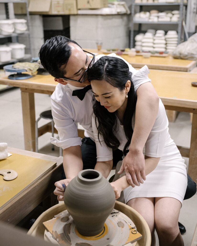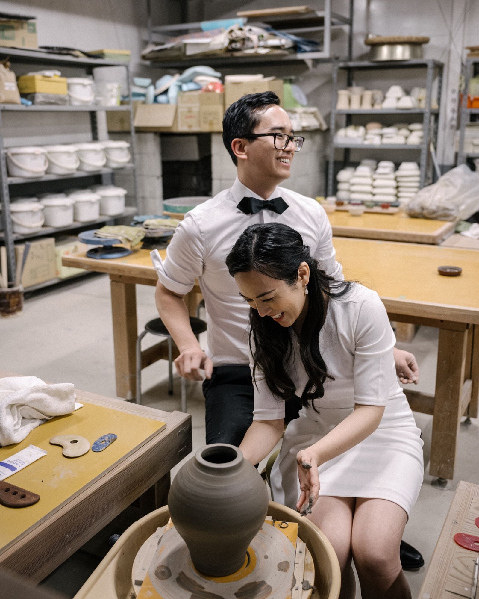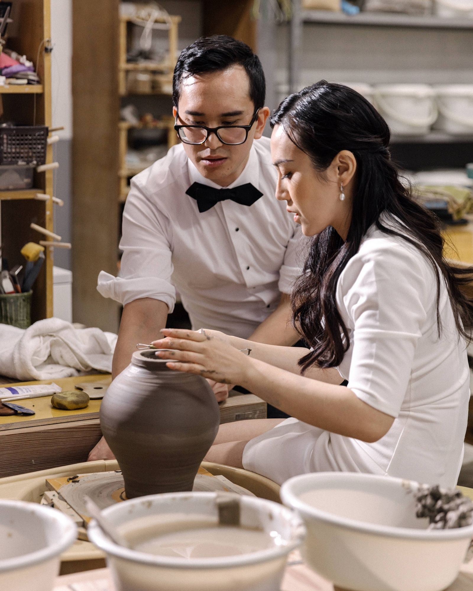 Here, in wedding dress and tuxedo, the couple sat down to make something together. One half each of a moon vase. Their hands messy. Laughter echoing in the studio. There was even that inevitable Ghost moment (you know the one). Yet somehow, not a drop of clay touched their wedding clothes.