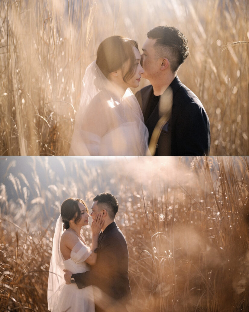 We worked quickly. The light at sunrise is brief and unforgiving. You either catch it or you don’t. Backlit pampas grass glowed gold against the mountain. The couple moved through the landscape with the kind of ease that only comes from trust – trust in themselves, in us, in the process.