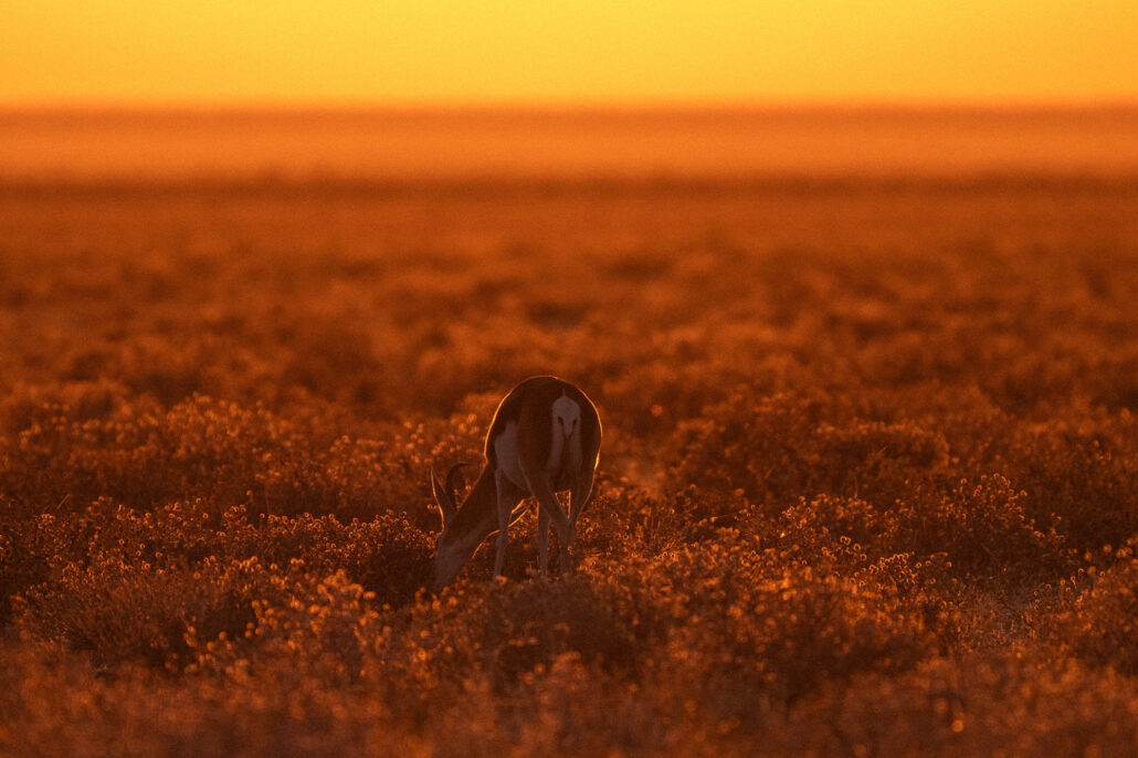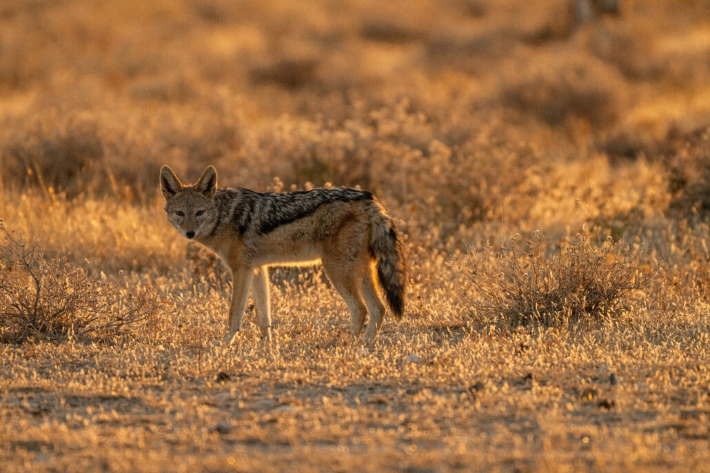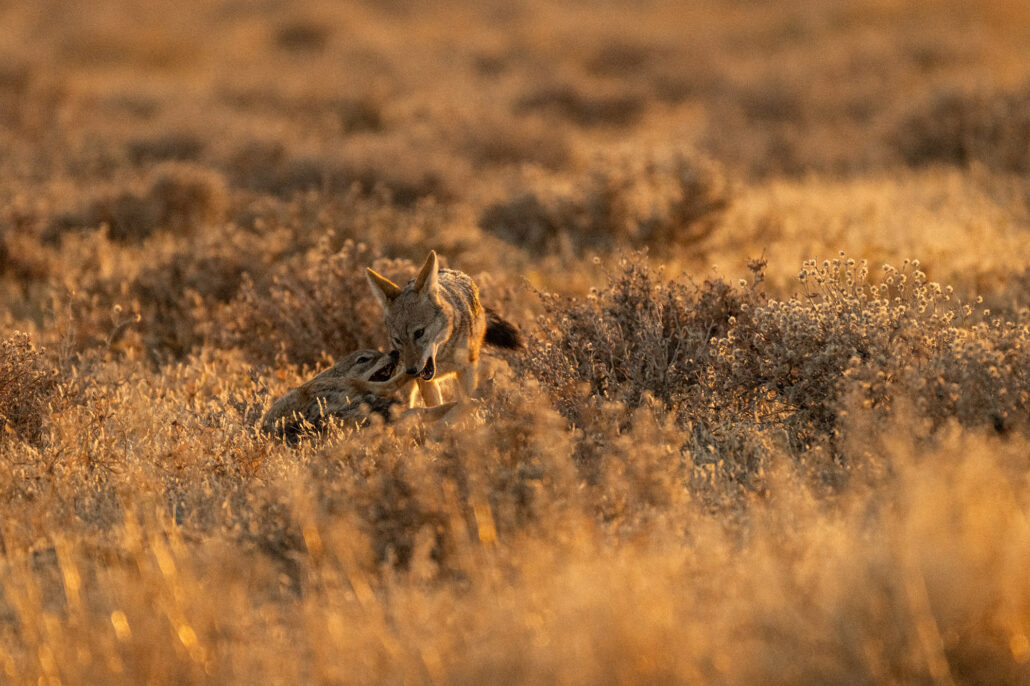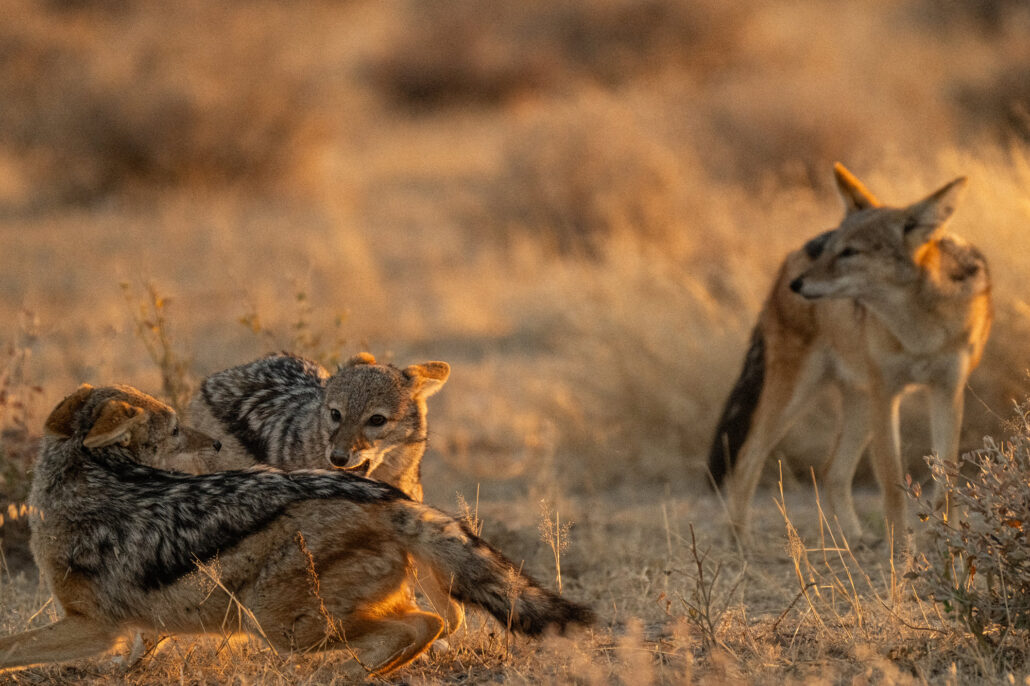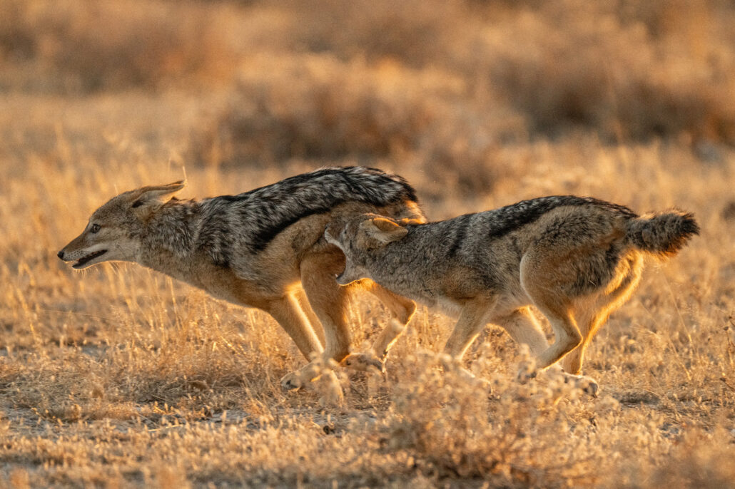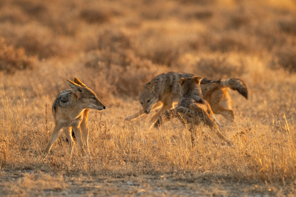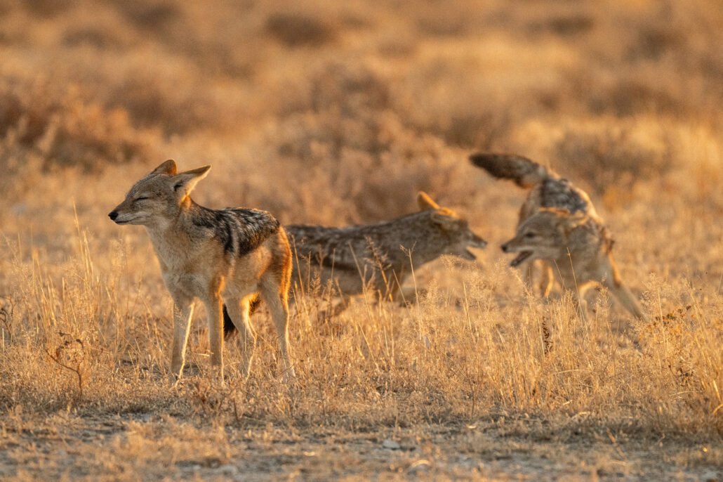 On this last morning in Etosha, when we were on our way out of the park, when we spotted them. Three jackals dancing in the early light, framed by golden dust.