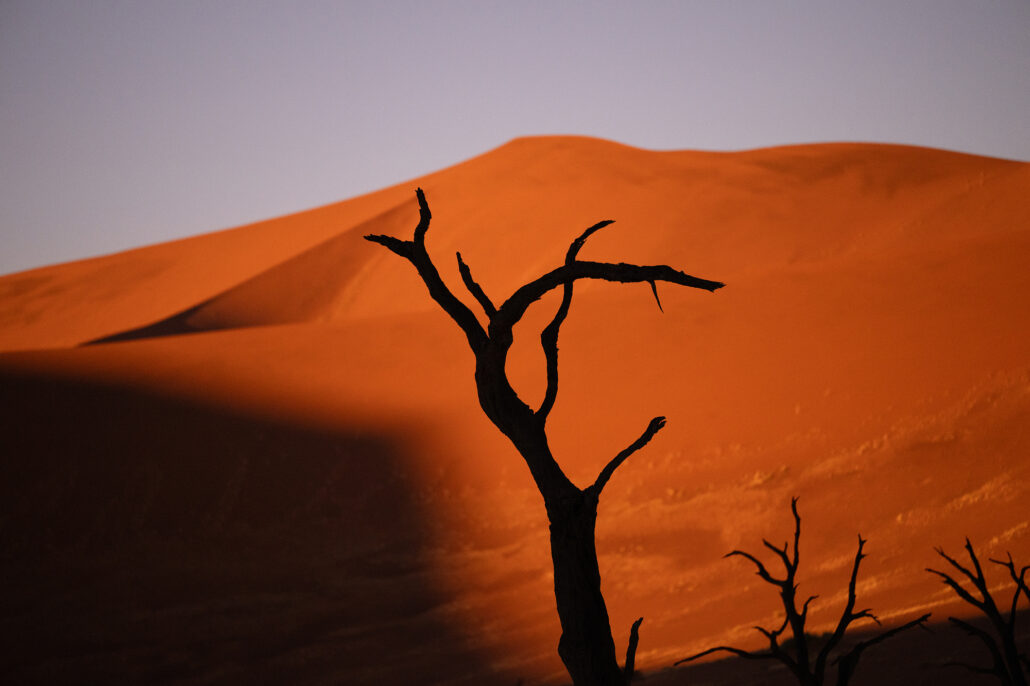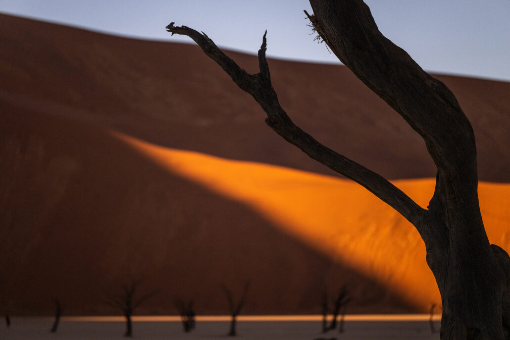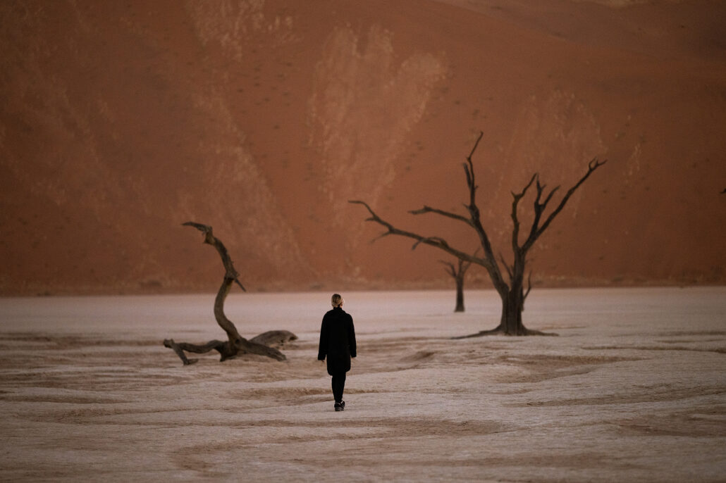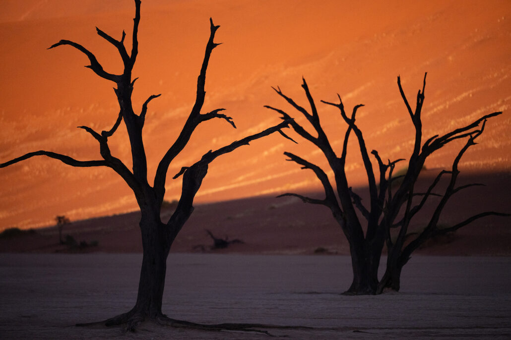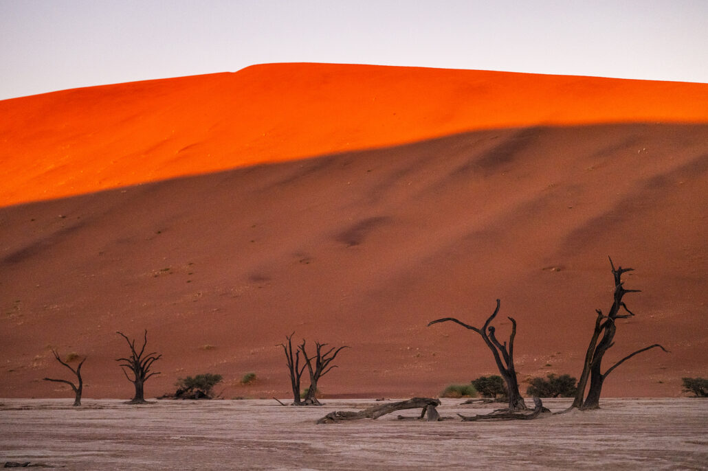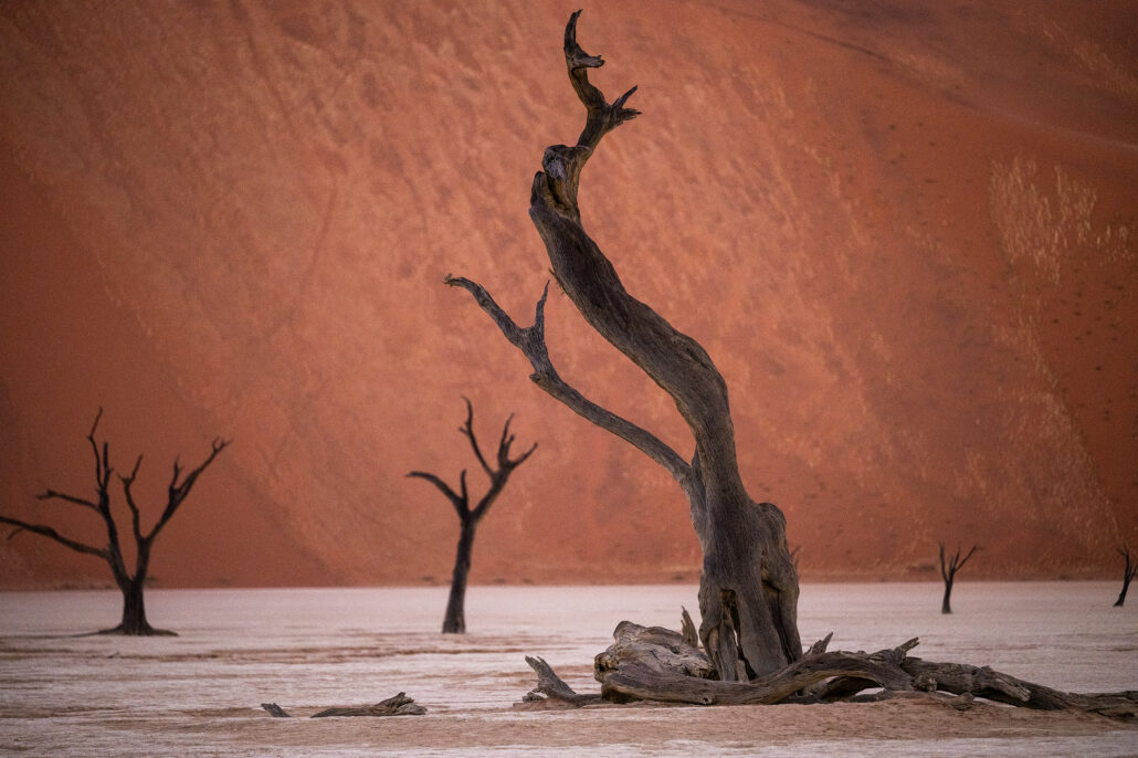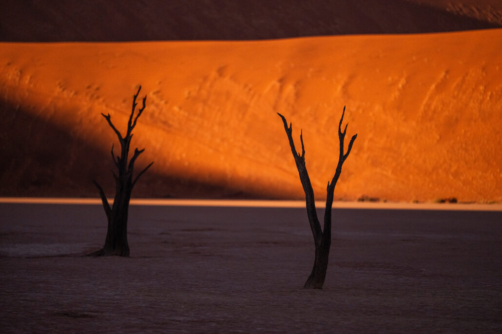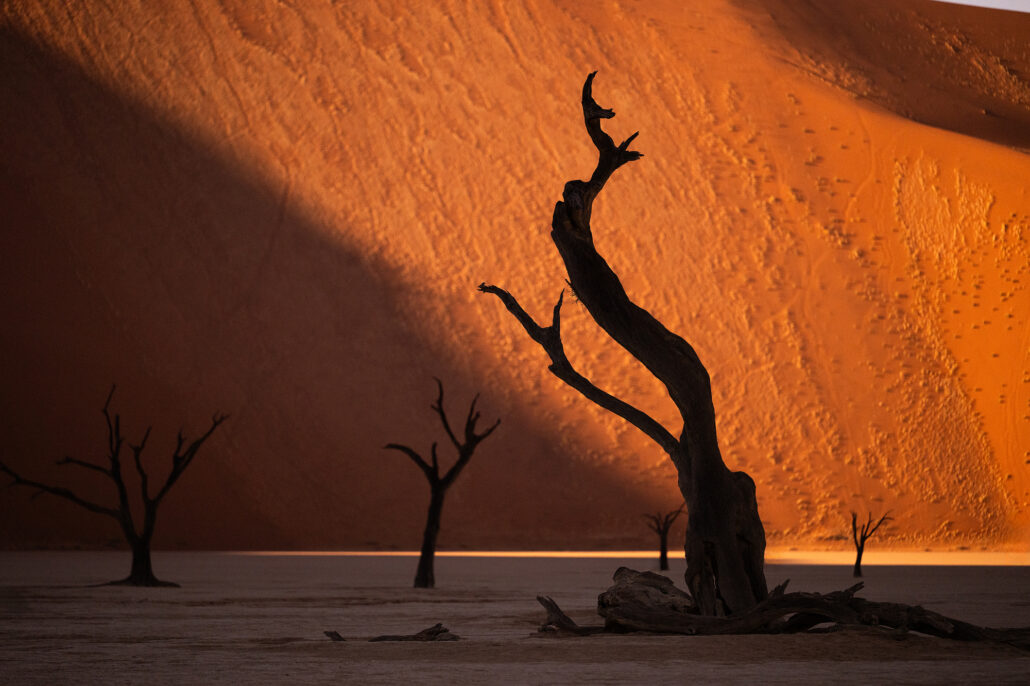 A white clay pan. Charred camelthorn trees over 600 years old, still standing — too dry here for even rot to take hold. Towering dunes all around.