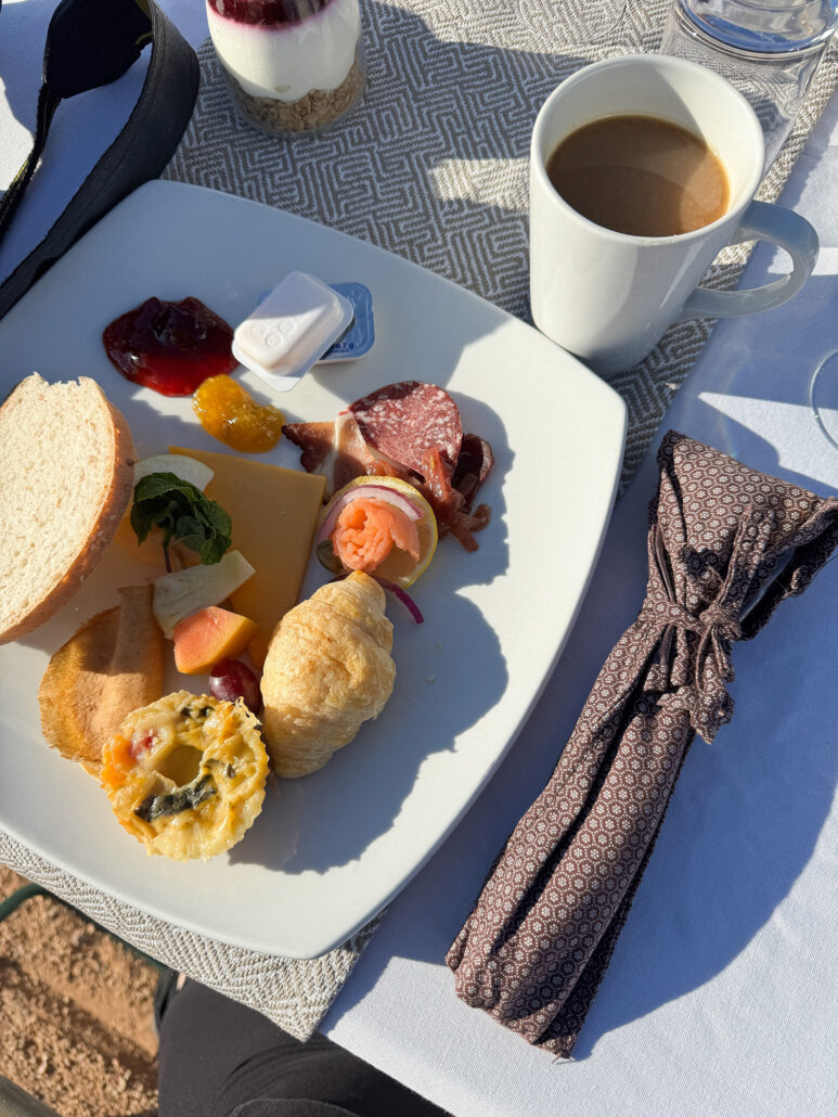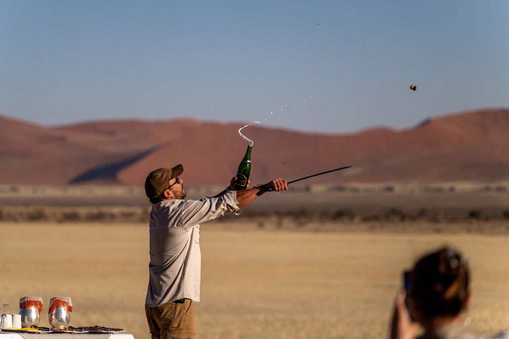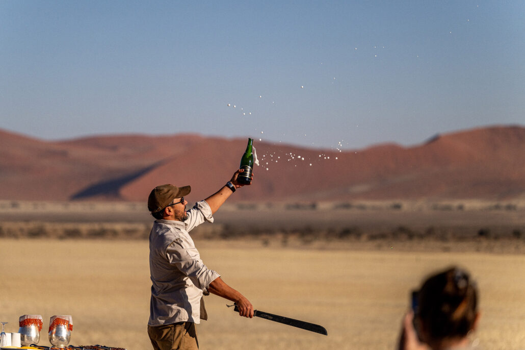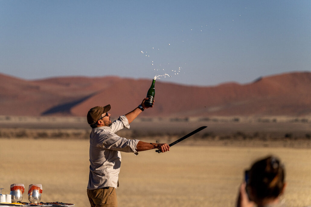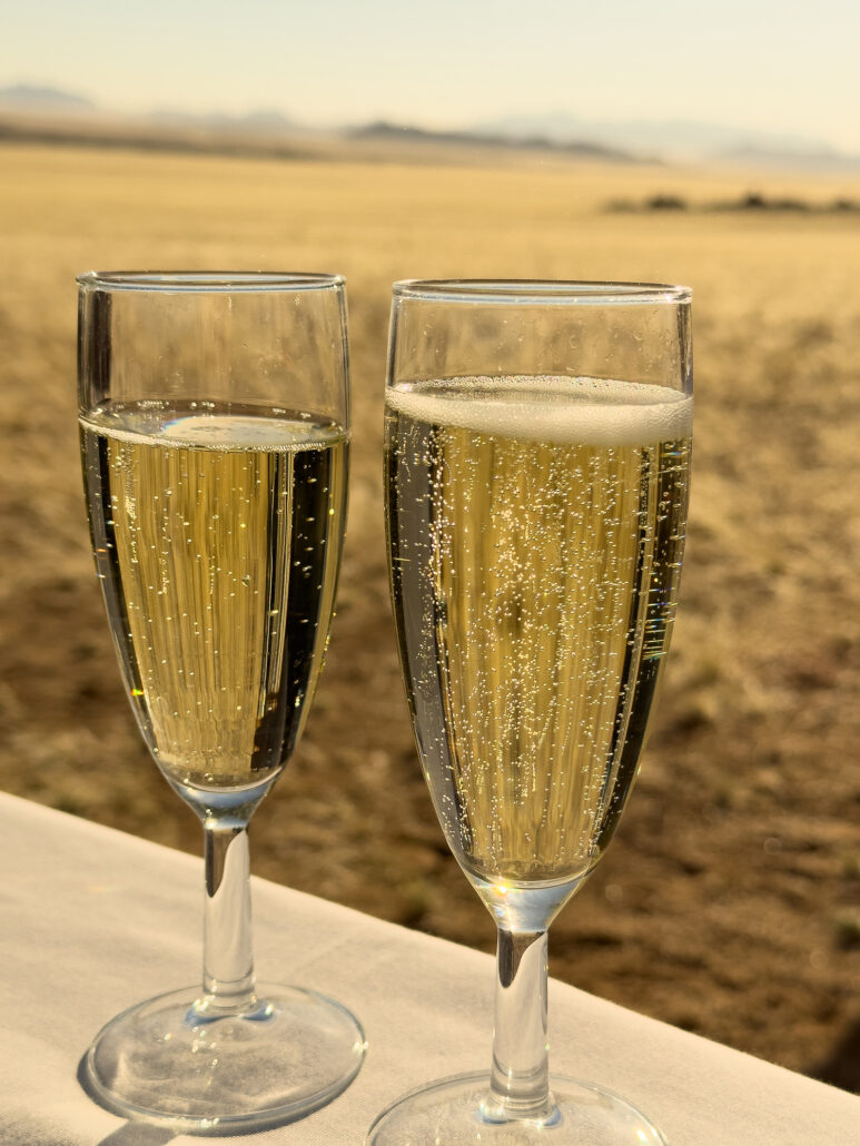 Because apparently, surviving an airborne wicker basket warrants bubbles at 9:00 a.m. We landed in a golden field where a tables awaited… a champagne buffet style breakfast under wide skies. Cured meats, fresh bread, fruit (every kind you can imagine) and homemade yogurt and granola. There was something utterly human and grounding about that moment, after so much time in the air. Feet on the earth, hearts still somewhere in the sky. Eating breakfast with an unbeatable view of the Sossusvlei dunes. In a golden field. In Namiba. Pinch us.
